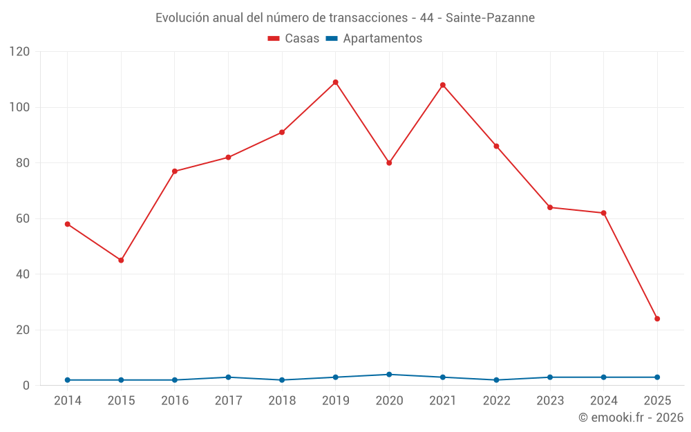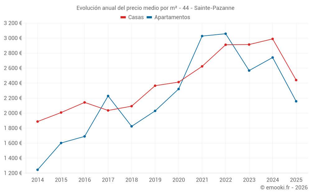El precio mediano en las 24 transacciones de casas de los últimos 6 meses en la comuna de Sainte-Pazanne fue de 2 441 € por metro cuadrado para un valor patrimonial medio de 220 500 €. Durante este período el 60% de las transacciones estuvieron entre 2 107 y 3 016 € por metro cuadrado (del 2º al 8º decil).