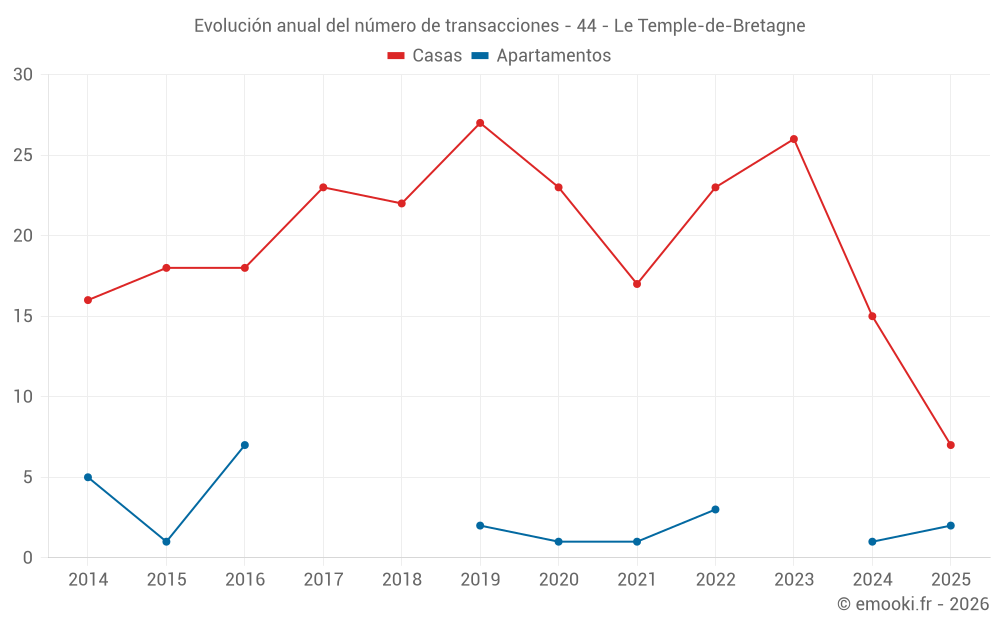 El precio mediano en las 17 transacciones de casas de los últimos 12 meses en la comuna de Le Temple-de-Bretagne fue de 2 346 € por metro cuadrado para un valor patrimonial medio de 249 000 €. Durante este período el 60% de las transacciones estuvieron entre 1 697 y 3 047 € por metro cuadrado (del 2º al 8º decil).