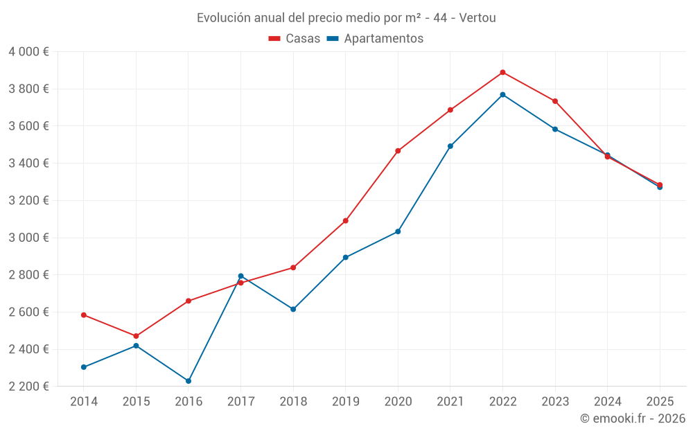 El precio mediano en las 25 transacciones de apartamentos de los últimos 6 meses en la comuna de Vertou fue de 3 271 € por metro cuadrado para un valor patrimonial medio de 212 200 €. Durante este período el 60% de las transacciones estuvieron entre 2 740 y 3 664 € por metro cuadrado (del 2º al 8º decil).