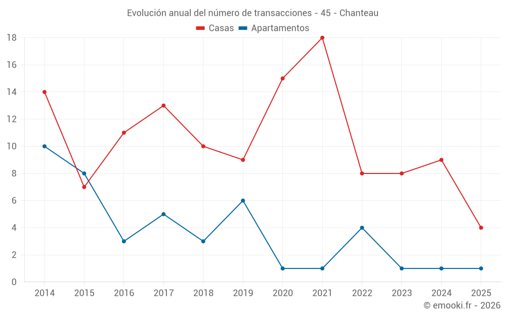 El precio mediano en las 17 transacciones de casas de los últimos 24 meses en la comuna de Chanteau fue de 2 105 € por metro cuadrado para un valor patrimonial medio de 204 200 €. Durante este período el 60% de las transacciones estuvieron entre 1 162 y 2 718 € por metro cuadrado (del 2º al 8º decil).