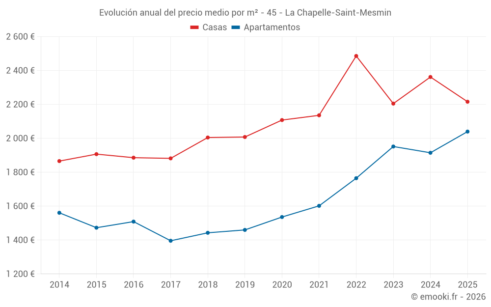 El precio mediano en las 18 transacciones de apartamentos de los últimos 6 meses en la comuna de La Chapelle-Saint-Mesmin fue de 2 040 € por metro cuadrado para un valor patrimonial medio de 126 250 €. Durante este período el 60% de las transacciones estuvieron entre 1 325 y 3 012 € por metro cuadrado (del 2º al 8º decil).