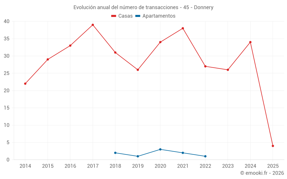 El precio mediano en las 23 transacciones de casas de los últimos 12 meses en la comuna de Donnery fue de 1 980 € por metro cuadrado para un valor patrimonial medio de 189 300 €. Durante este período el 60% de las transacciones estuvieron entre 1 797 y 2 320 € por metro cuadrado (del 2º al 8º decil).