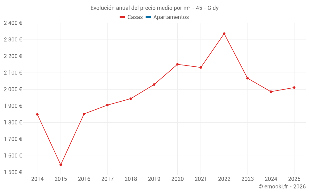 El precio mediano en las 24 transacciones de casas de los últimos 24 meses en la comuna de Gidy fue de 2 008 € por metro cuadrado para un valor patrimonial medio de 221 200 €. Durante este período el 60% de las transacciones estuvieron entre 1 516 y 2 281 € por metro cuadrado (del 2º al 8º decil).
