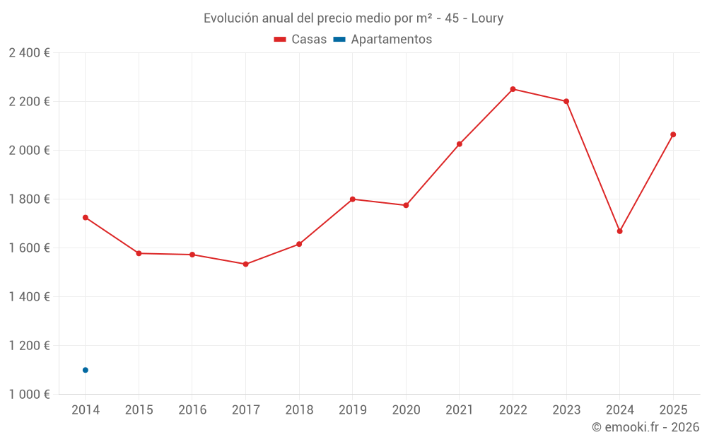 El precio mediano en las 40 transacciones de casas de los últimos 24 meses en la comuna de Loury fue de 1 876 € por metro cuadrado para un valor patrimonial medio de 220 950 €. Durante este período el 60% de las transacciones estuvieron entre 1 380 y 2 256 € por metro cuadrado (del 2º al 8º decil).