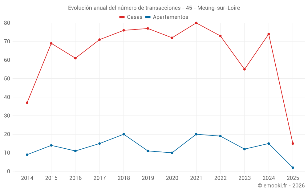 El precio mediano en las 59 transacciones de casas de los últimos 12 meses en la comuna de Meung-sur-Loire fue de 1 879 € por metro cuadrado para un valor patrimonial medio de 179 000 €. Durante este período el 60% de las transacciones estuvieron entre 1 540 y 2 283 € por metro cuadrado (del 2º al 8º decil).