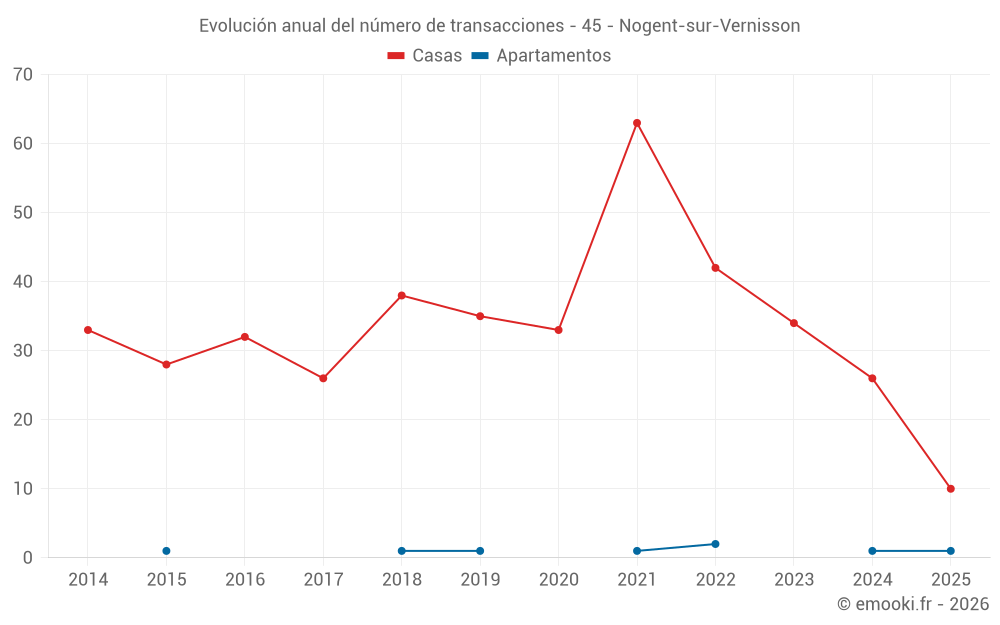 El precio mediano en las 23 transacciones de casas de los últimos 12 meses en la comuna de Nogent-sur-Vernisson fue de 1 554 € por metro cuadrado para un valor patrimonial medio de 115 000 €. Durante este período el 60% de las transacciones estuvieron entre 1 289 y 1 726 € por metro cuadrado (del 2º al 8º decil).