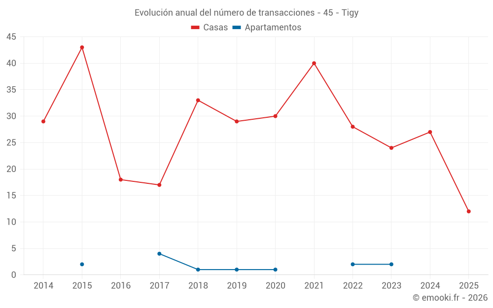 El precio mediano en las 28 transacciones de casas de los últimos 12 meses en la comuna de Tigy fue de 1 916 € por metro cuadrado para un valor patrimonial medio de 186 975 €. Durante este período el 60% de las transacciones estuvieron entre 1 236 y 2 064 € por metro cuadrado (del 2º al 8º decil).