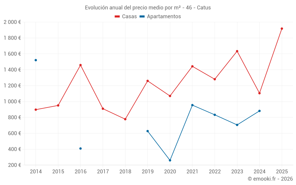 El precio mediano en las 23 transacciones de casas de los últimos 24 meses en la comuna de Catus fue de 1 446 € por metro cuadrado para un valor patrimonial medio de 135 500 €. Durante este período el 60% de las transacciones estuvieron entre 1 009 y 2 149 € por metro cuadrado (del 2º al 8º decil).