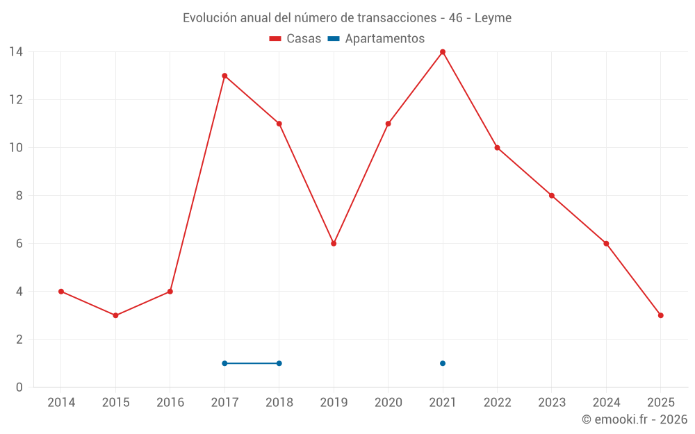 El precio mediano en las 15 transacciones de casas de los últimos 24 meses en la comuna de Leyme fue de 1 250 € por metro cuadrado para un valor patrimonial medio de 100 000 €. Durante este período el 60% de las transacciones estuvieron entre 991 y 1 723 € por metro cuadrado (del 2º al 8º decil).