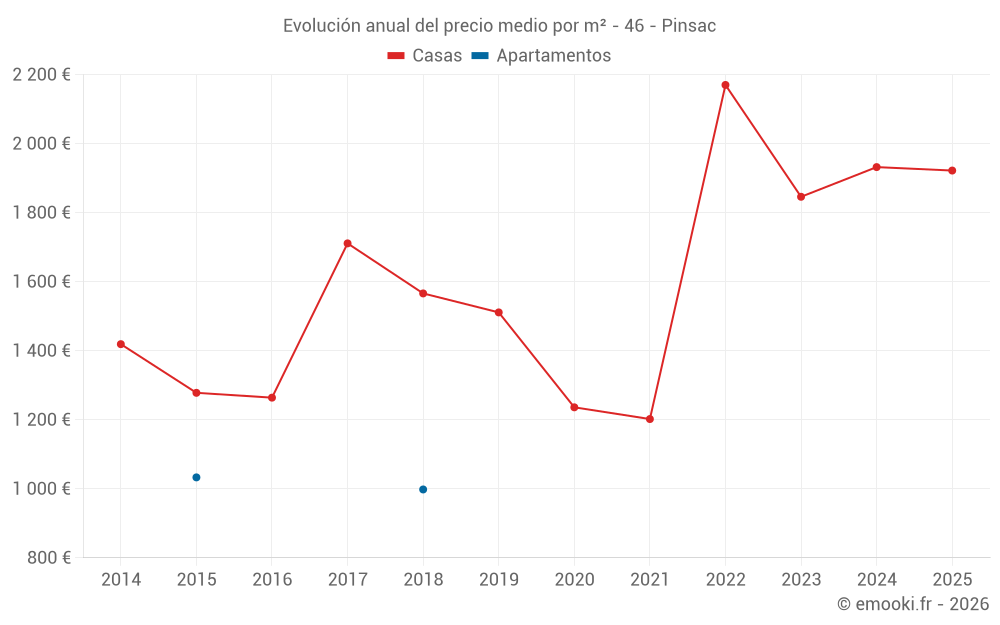 El precio mediano en las 18 transacciones de casas de los últimos 24 meses en la comuna de Pinsac fue de 1 928 € por metro cuadrado para un valor patrimonial medio de 189 000 €. Durante este período el 60% de las transacciones estuvieron entre 1 346 y 2 630 € por metro cuadrado (del 2º al 8º decil).