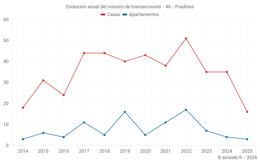 El precio mediano en las 34 transacciones de casas de los últimos 12 meses en la comuna de Pradines fue de 1 790 € por metro cuadrado para un valor patrimonial medio de 175 000 €. Durante este período el 60% de las transacciones estuvieron entre 1 280 y 2 113 € por metro cuadrado (del 2º al 8º decil).
