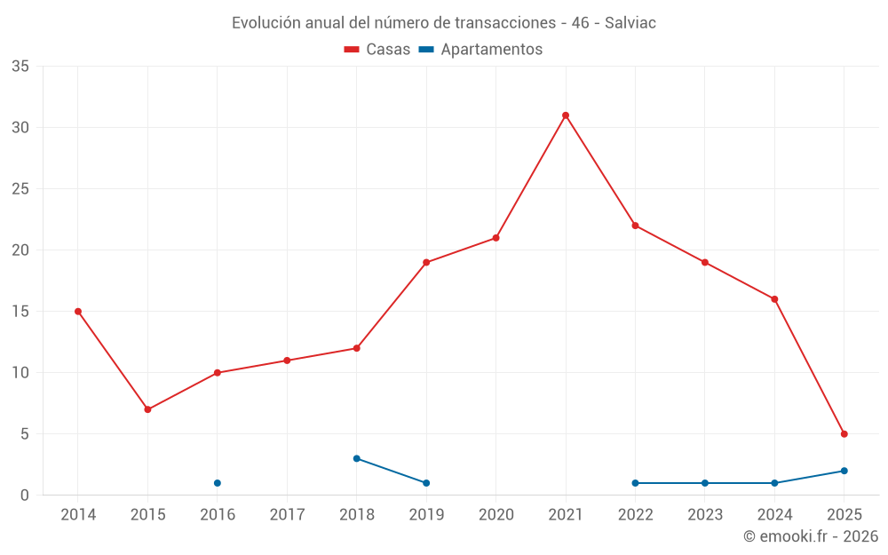 El precio mediano en las 32 transacciones de casas de los últimos 24 meses en la comuna de Salviac fue de 1 682 € por metro cuadrado para un valor patrimonial medio de 150 250 €. Durante este período el 60% de las transacciones estuvieron entre 951 y 1 992 € por metro cuadrado (del 2º al 8º decil).