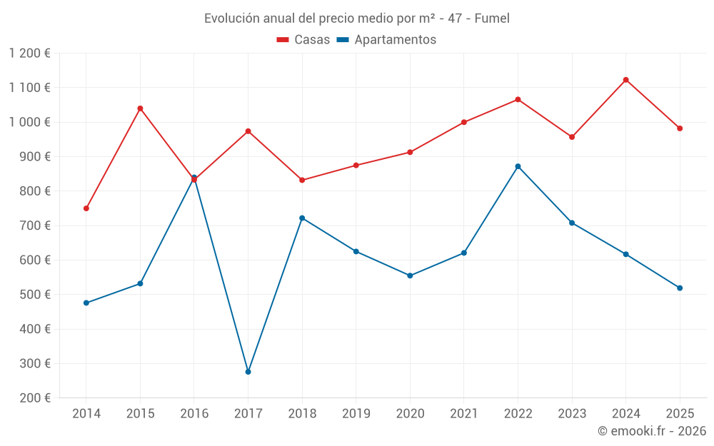 El precio mediano en las 24 transacciones de casas de los últimos 6 meses en la comuna de Fumel fue de 982 € por metro cuadrado para un valor patrimonial medio de 100 450 €. Durante este período el 60% de las transacciones estuvieron entre 611 y 1 915 € por metro cuadrado (del 2º al 8º decil).