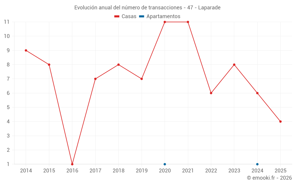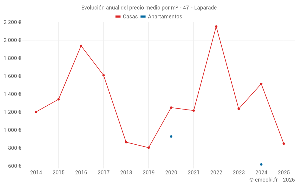 El precio mediano en las 15 transacciones de casas de los últimos 24 meses en la comuna de Laparade fue de 1 208 € por metro cuadrado para un valor patrimonial medio de 150 000 €. Durante este período el 60% de las transacciones estuvieron entre 706 y 2 189 € por metro cuadrado (del 2º al 8º decil).