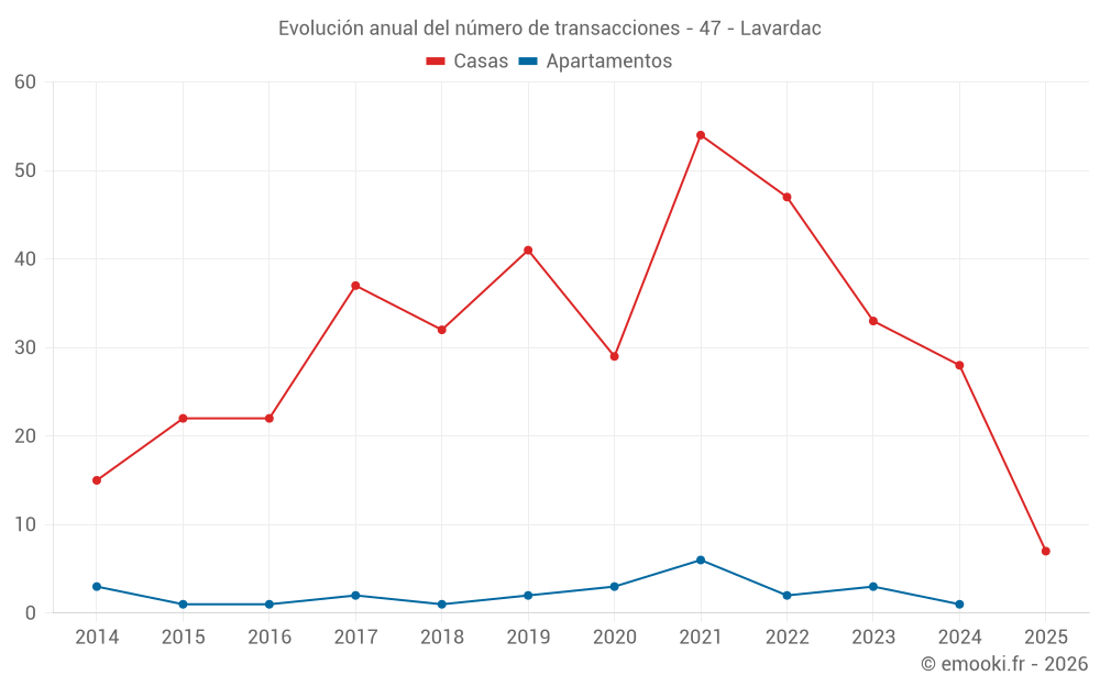 El precio mediano en las 24 transacciones de casas de los últimos 12 meses en la comuna de Lavardac fue de 1 376 € por metro cuadrado para un valor patrimonial medio de 153 500 €. Durante este período el 60% de las transacciones estuvieron entre 799 y 1 824 € por metro cuadrado (del 2º al 8º decil).