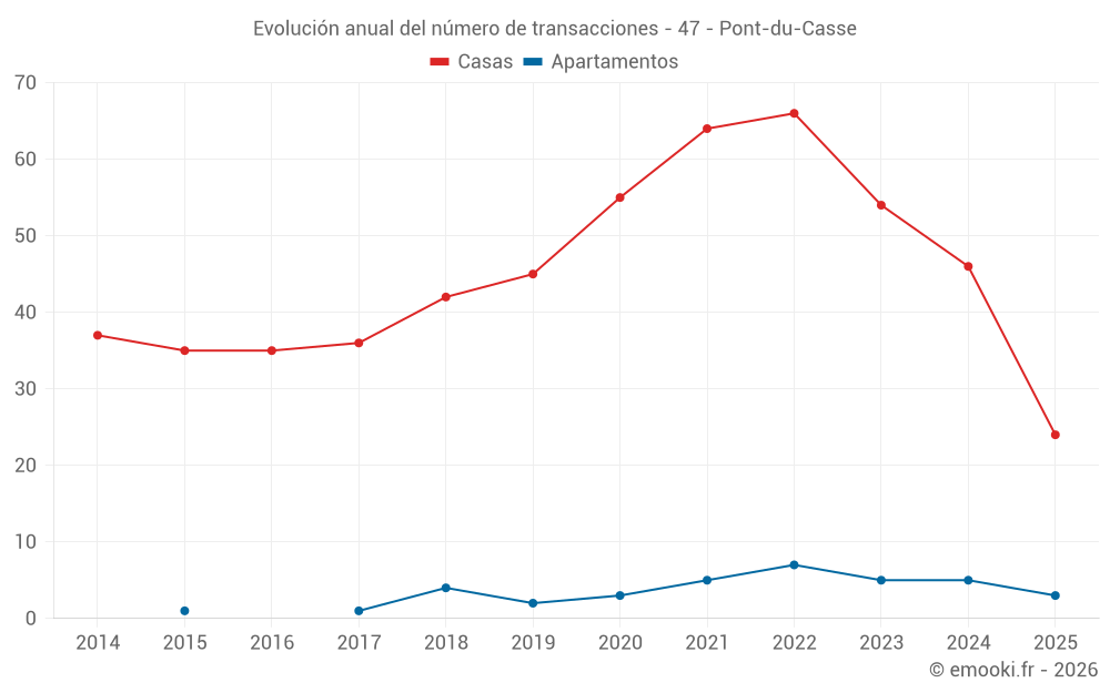 El precio mediano en las 24 transacciones de casas de los últimos 6 meses en la comuna de Pont-du-Casse fue de 1 899 € por metro cuadrado para un valor patrimonial medio de 182 500 €. Durante este período el 60% de las transacciones estuvieron entre 1 352 y 2 293 € por metro cuadrado (del 2º al 8º decil).