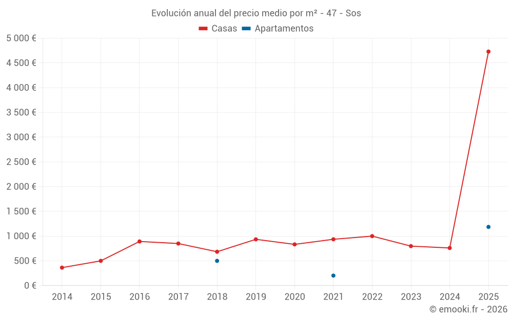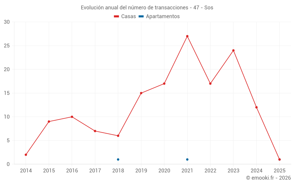 El precio mediano en las 20 transacciones de casas de los últimos 24 meses en la comuna de Sos fue de 764 € por metro cuadrado para un valor patrimonial medio de 69 000 €. Durante este período el 60% de las transacciones estuvieron entre 215 y 1 384 € por metro cuadrado (del 2º al 8º decil).
