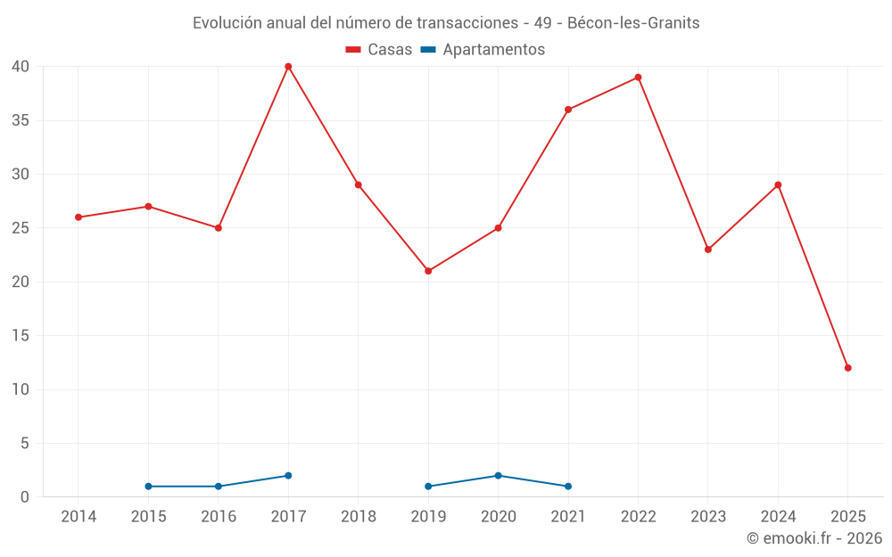 El precio mediano en las 25 transacciones de casas de los últimos 12 meses en la comuna de Bécon-les-Granits fue de 2 216 € por metro cuadrado para un valor patrimonial medio de 209 035 €. Durante este período el 60% de las transacciones estuvieron entre 1 776 y 2 787 € por metro cuadrado (del 2º al 8º decil).