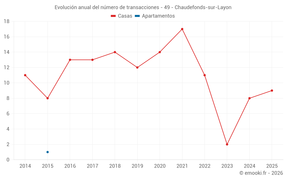 El precio mediano en las 17 transacciones de casas de los últimos 24 meses en la comuna de Chaudefonds-sur-Layon fue de 2 076 € por metro cuadrado para un valor patrimonial medio de 158 000 €. Durante este período el 60% de las transacciones estuvieron entre 1 249 y 2 335 € por metro cuadrado (del 2º al 8º decil).