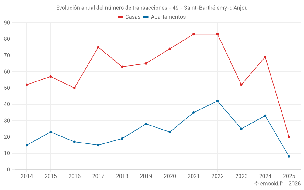 El precio mediano en las 20 transacciones de casas de los últimos 6 meses en la comuna de Saint-Barthélemy-d'Anjou fue de 3 054 € por metro cuadrado para un valor patrimonial medio de 310 000 €. Durante este período el 60% de las transacciones estuvieron entre 2 609 y 3 376 € por metro cuadrado (del 2º al 8º decil).