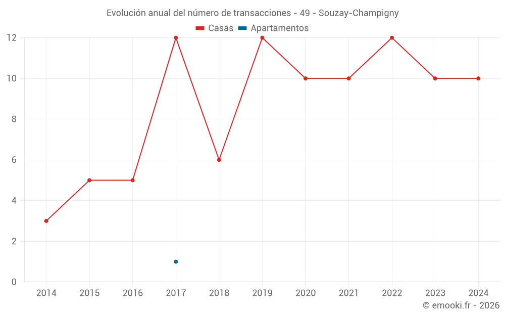 El precio mediano en las 17 transacciones de casas de los últimos 24 meses en la comuna de Souzay-Champigny fue de 1 300 € por metro cuadrado para un valor patrimonial medio de 156 000 €. Durante este período el 60% de las transacciones estuvieron entre 1 011 y 2 330 € por metro cuadrado (del 2º al 8º decil).