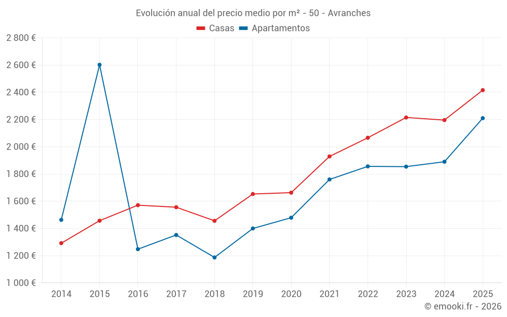 El precio mediano en las 24 transacciones de apartamentos de los últimos 6 meses en la comuna de Avranches fue de 2 210 € por metro cuadrado para un valor patrimonial medio de 121 250 €. Durante este período el 60% de las transacciones estuvieron entre 1 822 y 2 640 € por metro cuadrado (del 2º al 8º decil).