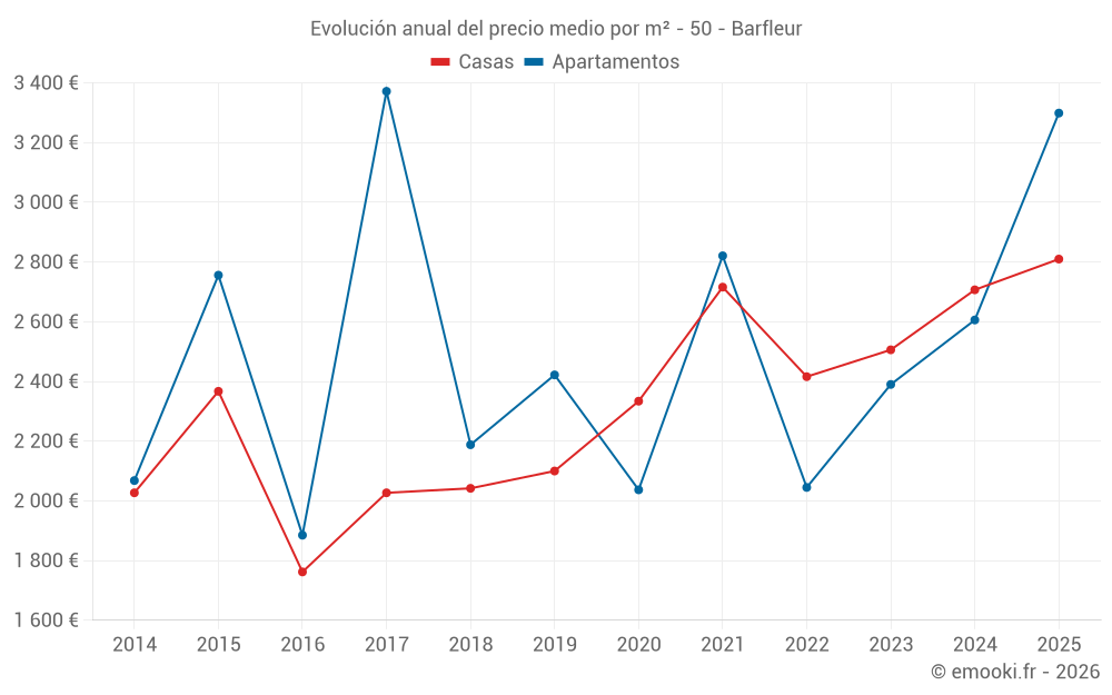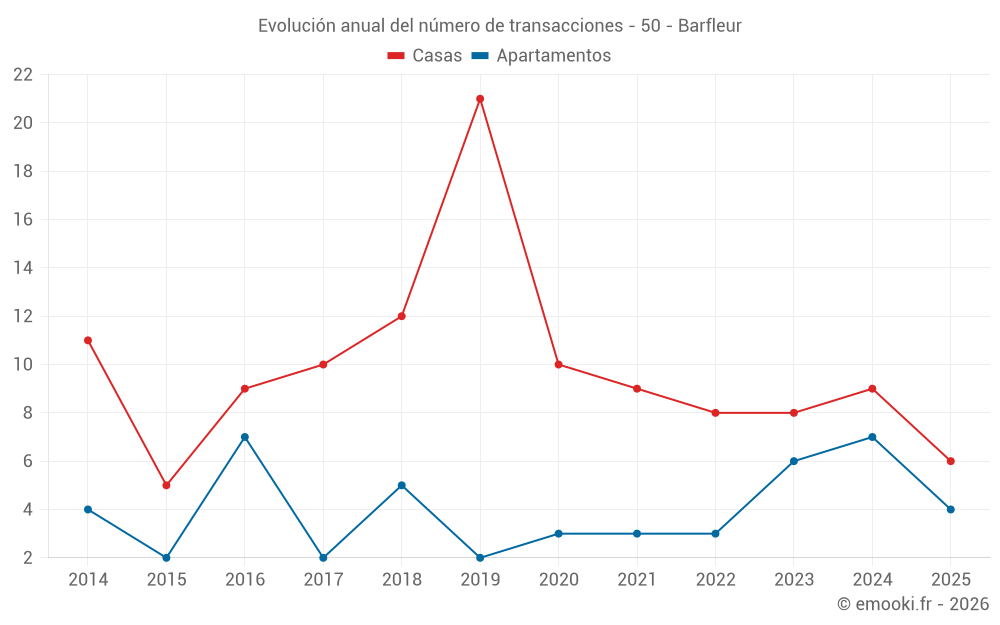 El precio mediano en las 15 transacciones de apartamentos de los últimos 24 meses en la comuna de Barfleur fue de 2 623 € por metro cuadrado para un valor patrimonial medio de 158 000 €. Durante este período el 60% de las transacciones estuvieron entre 2 092 y 3 809 € por metro cuadrado (del 2º al 8º decil).