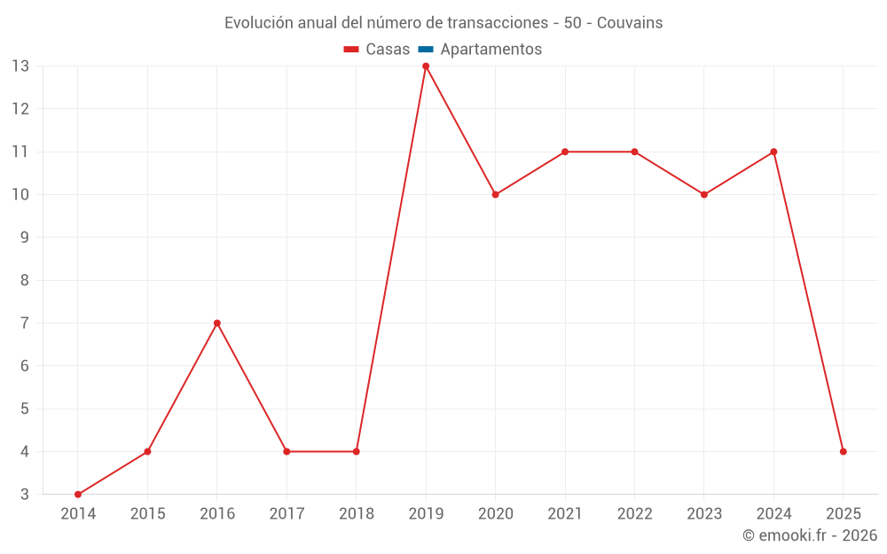 El precio mediano en las 19 transacciones de casas de los últimos 24 meses en la comuna de Couvains fue de 1 270 € por metro cuadrado para un valor patrimonial medio de 98 000 €. Durante este período el 60% de las transacciones estuvieron entre 682 y 1 713 € por metro cuadrado (del 2º al 8º decil).