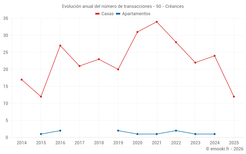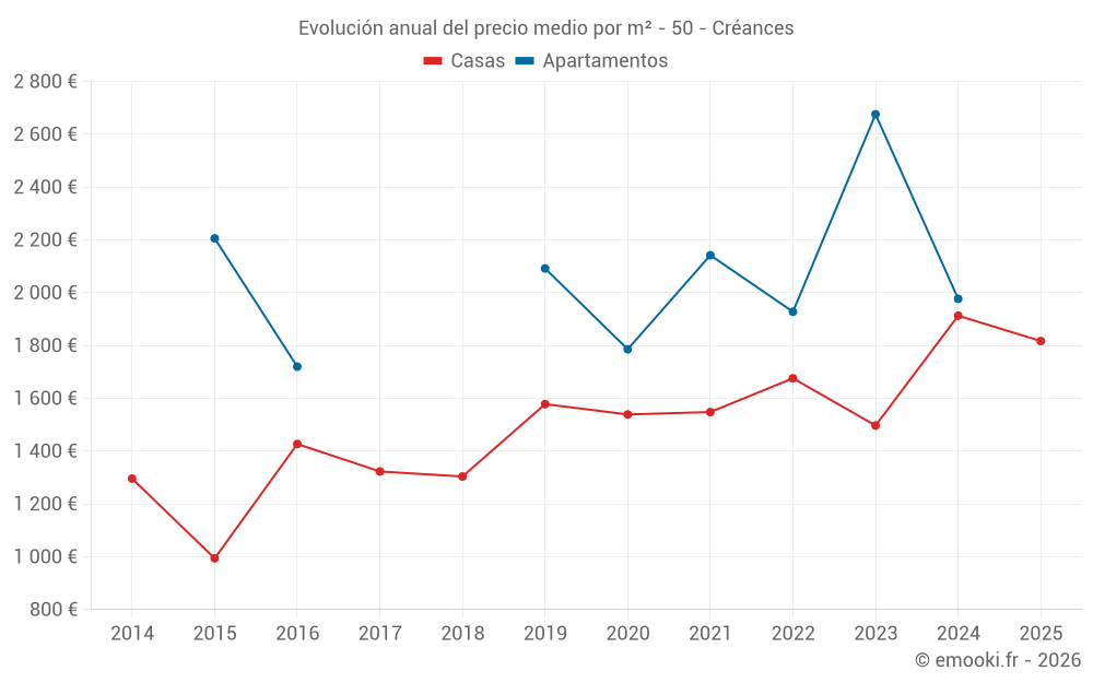 El precio mediano en las 26 transacciones de casas de los últimos 12 meses en la comuna de Créances fue de 1 854 € por metro cuadrado para un valor patrimonial medio de 162 120 €. Durante este período el 60% de las transacciones estuvieron entre 1 277 y 2 357 € por metro cuadrado (del 2º al 8º decil).