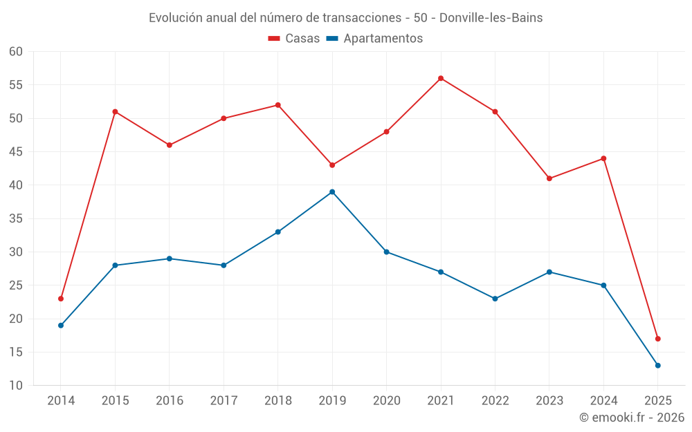 El precio mediano en las 30 transacciones de apartamentos de los últimos 12 meses en la comuna de Donville-les-Bains fue de 3 698 € por metro cuadrado para un valor patrimonial medio de 158 350 €. Durante este período el 60% de las transacciones estuvieron entre 2 987 y 4 370 € por metro cuadrado (del 2º al 8º decil).