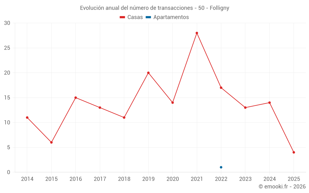 El precio mediano en las 23 transacciones de casas de los últimos 24 meses en la comuna de Folligny fue de 1 346 € por metro cuadrado para un valor patrimonial medio de 140 000 €. Durante este período el 60% de las transacciones estuvieron entre 948 y 2 326 € por metro cuadrado (del 2º al 8º decil).