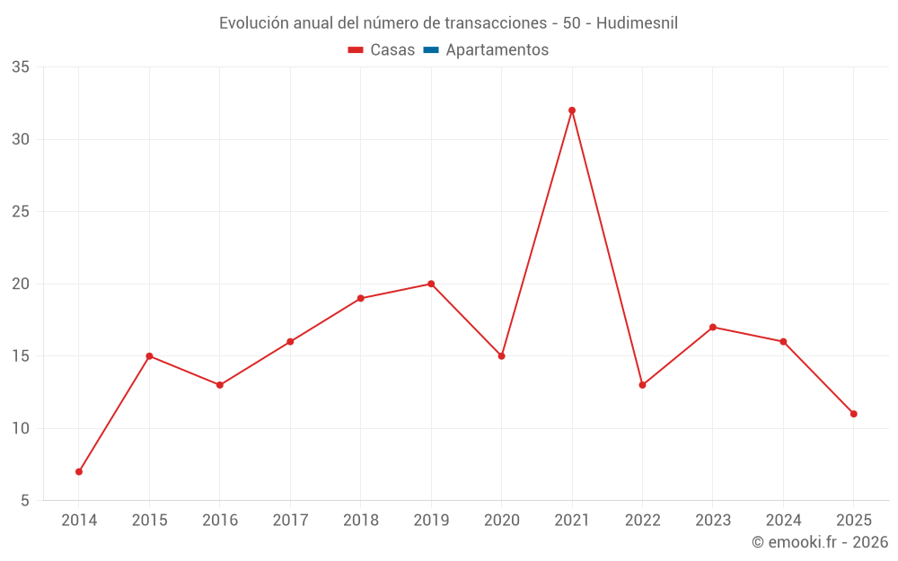 El precio mediano en las 23 transacciones de casas de los últimos 12 meses en la comuna de Hudimesnil fue de 2 094 € por metro cuadrado para un valor patrimonial medio de 175 000 €. Durante este período el 60% de las transacciones estuvieron entre 1 310 y 2 844 € por metro cuadrado (del 2º al 8º decil).