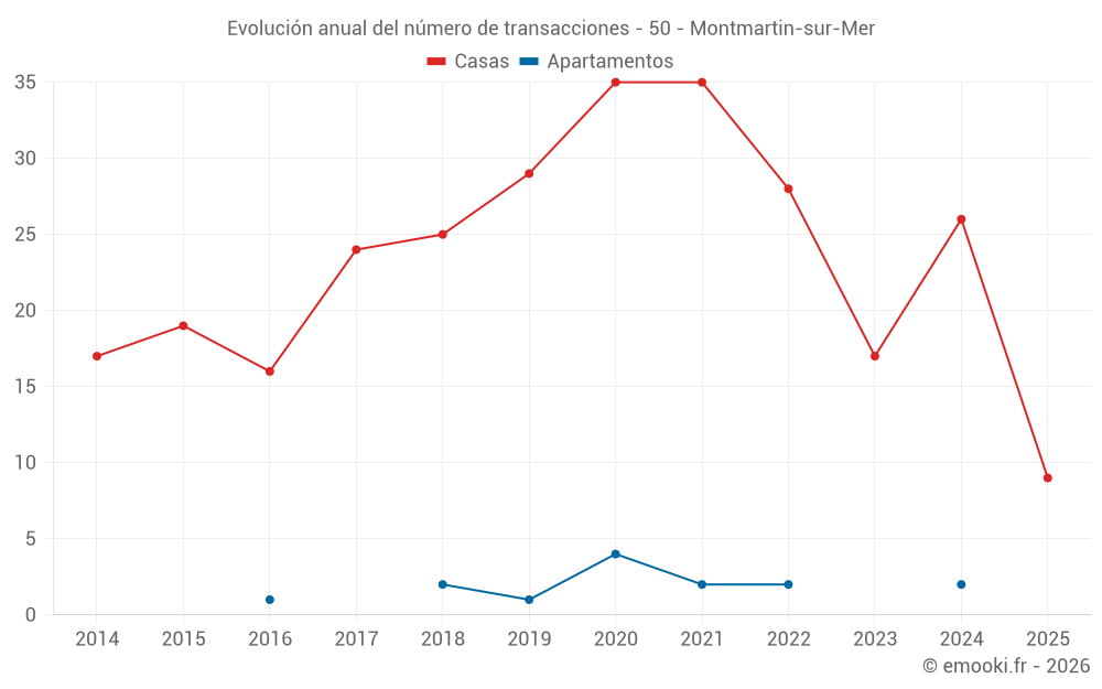 El precio mediano en las 20 transacciones de casas de los últimos 12 meses en la comuna de Montmartin-sur-Mer fue de 2 256 € por metro cuadrado para un valor patrimonial medio de 241 000 €. Durante este período el 60% de las transacciones estuvieron entre 1 703 y 2 670 € por metro cuadrado (del 2º al 8º decil).