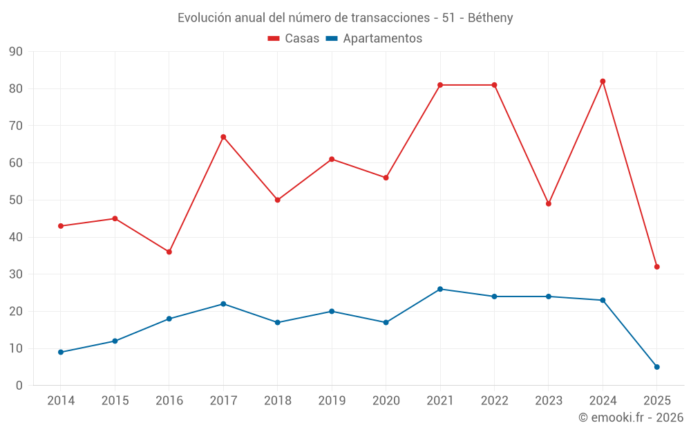 El precio mediano en las 32 transacciones de casas de los últimos 6 meses en la comuna de Bétheny fue de 2 804 € por metro cuadrado para un valor patrimonial medio de 261 000 €. Durante este período el 60% de las transacciones estuvieron entre 2 294 y 3 007 € por metro cuadrado (del 2º al 8º decil).