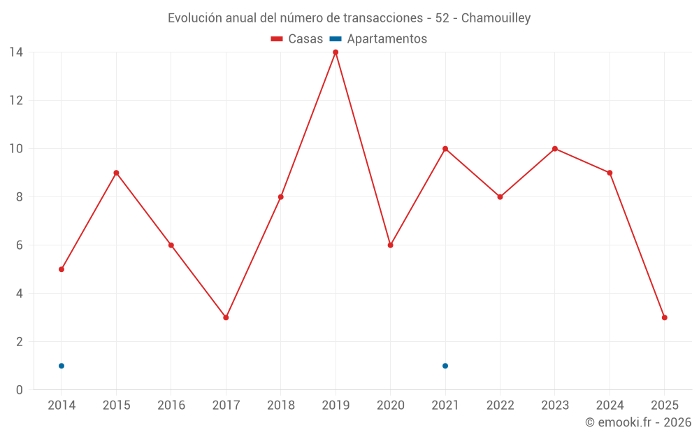 El precio mediano en las 18 transacciones de casas de los últimos 24 meses en la comuna de Chamouilley fue de 1 192 € por metro cuadrado para un valor patrimonial medio de 93 525 €. Durante este período el 60% de las transacciones estuvieron entre 392 y 1 558 € por metro cuadrado (del 2º al 8º decil).