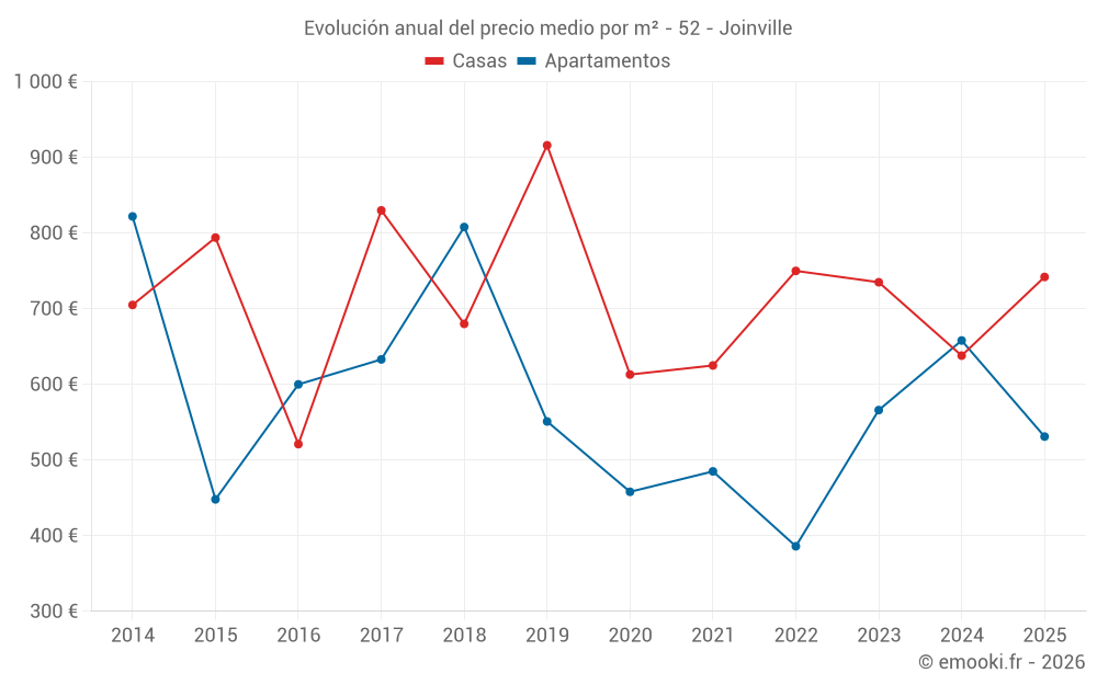 El precio mediano en las 30 transacciones de casas de los últimos 12 meses en la comuna de Joinville fue de 668 € por metro cuadrado para un valor patrimonial medio de 71 500 €. Durante este período el 60% de las transacciones estuvieron entre 511 y 1 344 € por metro cuadrado (del 2º al 8º decil).