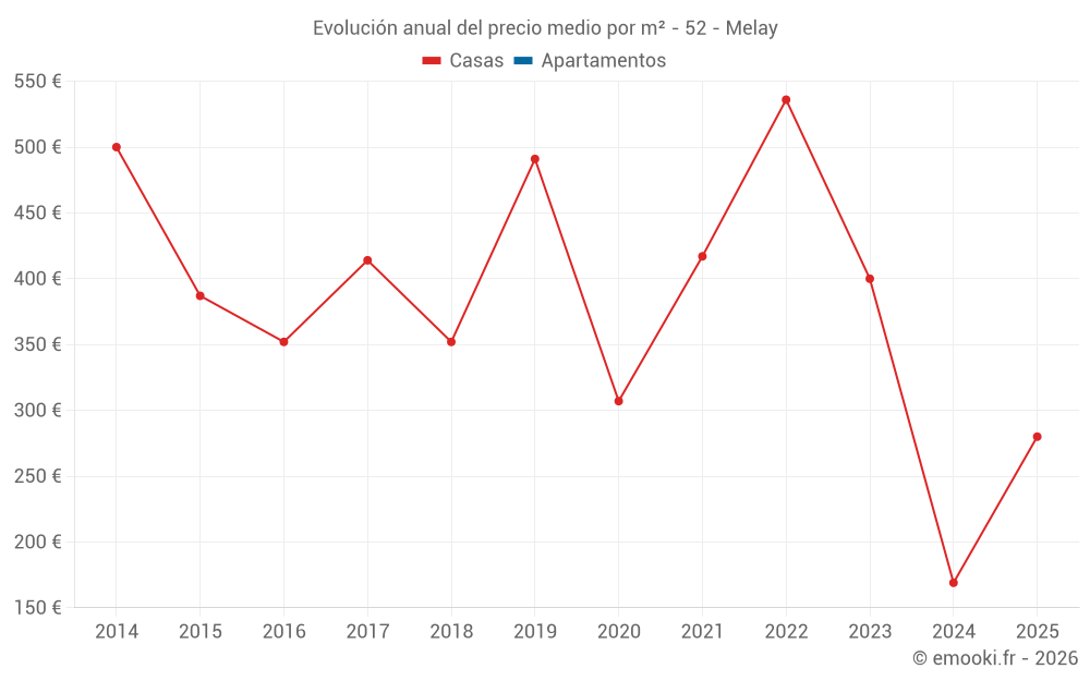 El precio mediano en las 24 transacciones de casas de los últimos 24 meses en la comuna de Melay fue de 314 € por metro cuadrado para un valor patrimonial medio de 32 500 €. Durante este período el 60% de las transacciones estuvieron entre 92 y 766 € por metro cuadrado (del 2º al 8º decil).