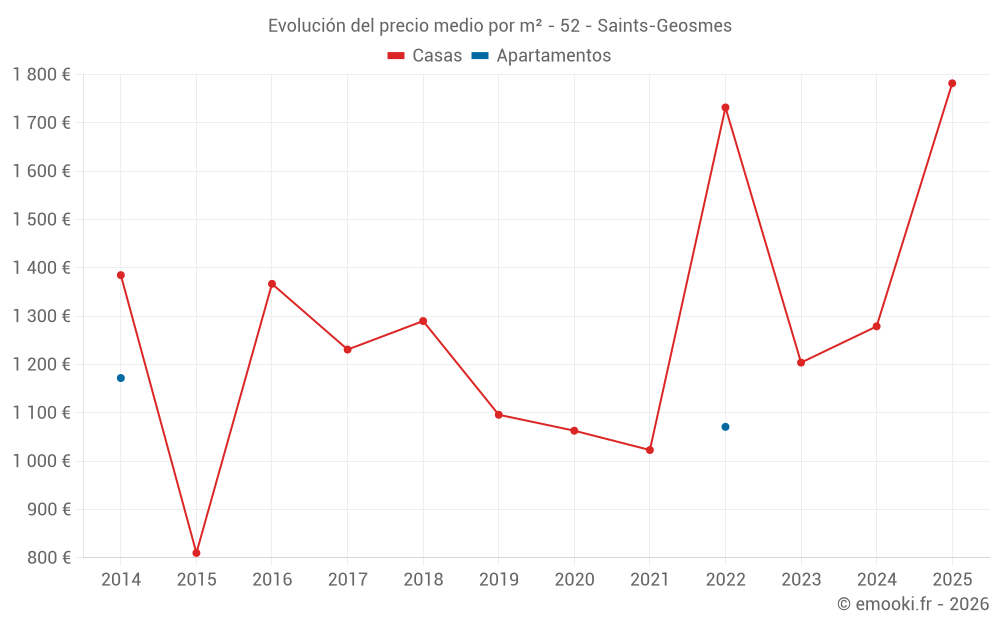 El precio mediano en las 17 transacciones de casas de los últimos 24 meses en la comuna de Saints-Geosmes fue de 1 510 € por metro cuadrado para un valor patrimonial medio de 151 500 €. Durante este período el 60% de las transacciones estuvieron entre 798 y 1 859 € por metro cuadrado (del 2º al 8º decil).
