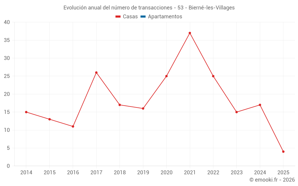 El precio mediano en las 28 transacciones de casas de los últimos 24 meses en la comuna de Bierné-les-Villages fue de 1 152 € por metro cuadrado para un valor patrimonial medio de 101 000 €. Durante este período el 60% de las transacciones estuvieron entre 594 y 1 510 € por metro cuadrado (del 2º al 8º decil).