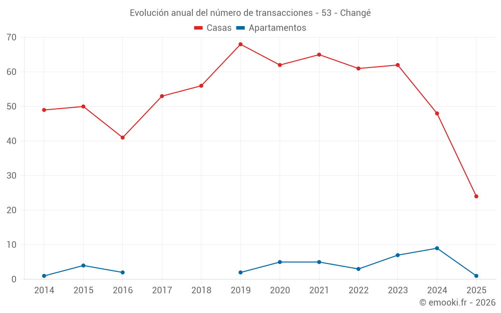 El precio mediano en las 24 transacciones de casas de los últimos 6 meses en la comuna de Changé fue de 2 368 € por metro cuadrado para un valor patrimonial medio de 255 000 €. Durante este período el 60% de las transacciones estuvieron entre 2 039 y 2 866 € por metro cuadrado (del 2º al 8º decil).