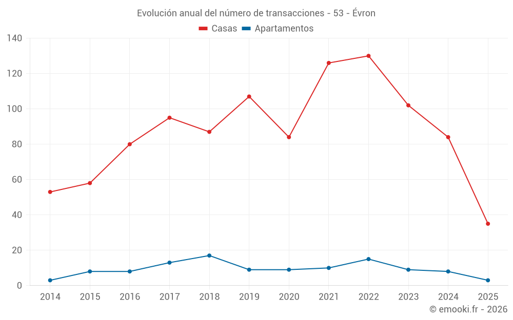 El precio mediano en las 14 transacciones de apartamentos de los últimos 24 meses en la comuna de Évron fue de 1 008 € por metro cuadrado para un valor patrimonial medio de 62 443 €. Durante este período el 60% de las transacciones estuvieron entre 755 y 1 597 € por metro cuadrado (del 2º al 8º decil).