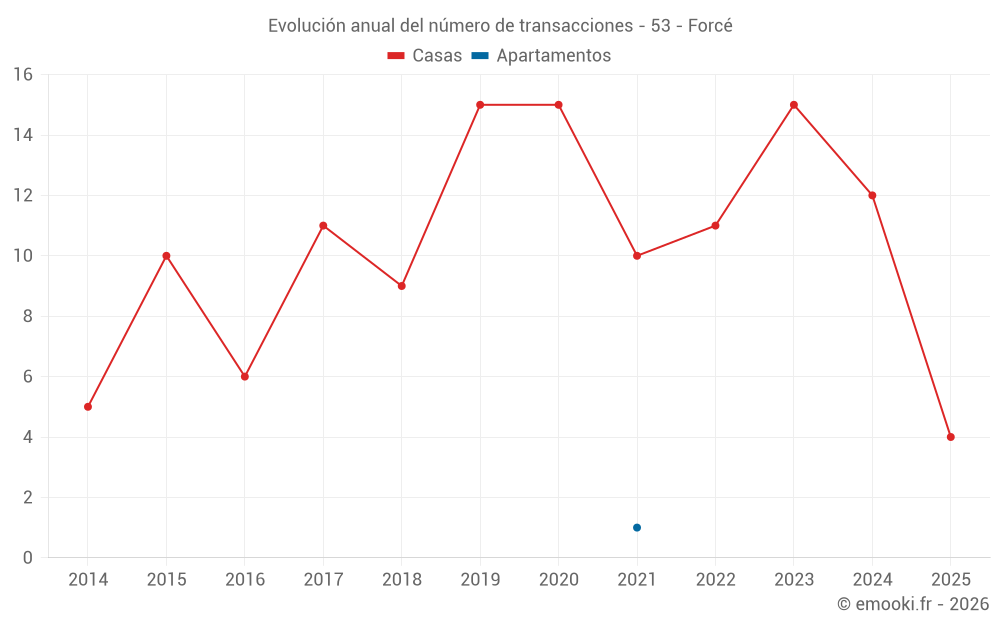 El precio mediano en las 22 transacciones de casas de los últimos 24 meses en la comuna de Forcé fue de 1 654 € por metro cuadrado para un valor patrimonial medio de 177 195 €. Durante este período el 60% de las transacciones estuvieron entre 1 097 y 2 077 € por metro cuadrado (del 2º al 8º decil).