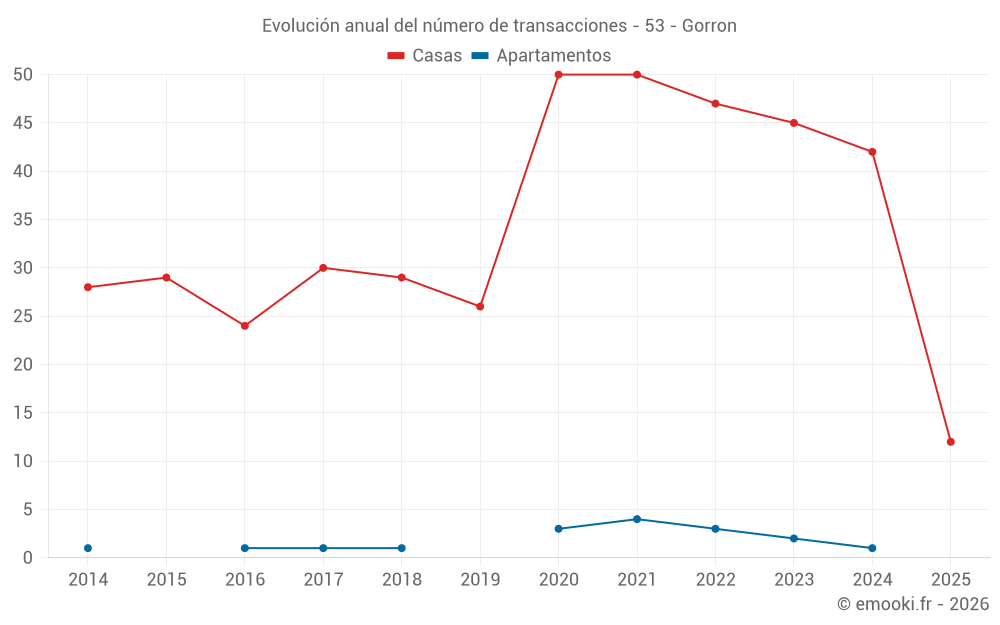 El precio mediano en las 37 transacciones de casas de los últimos 12 meses en la comuna de Gorron fue de 909 € por metro cuadrado para un valor patrimonial medio de 77 000 €. Durante este período el 60% de las transacciones estuvieron entre 601 y 1 554 € por metro cuadrado (del 2º al 8º decil).