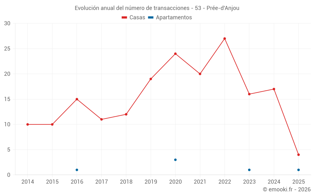 El precio mediano en las 29 transacciones de casas de los últimos 24 meses en la comuna de Prée-d'Anjou fue de 1 330 € por metro cuadrado para un valor patrimonial medio de 140 000 €. Durante este período el 60% de las transacciones estuvieron entre 858 y 1 752 € por metro cuadrado (del 2º al 8º decil).