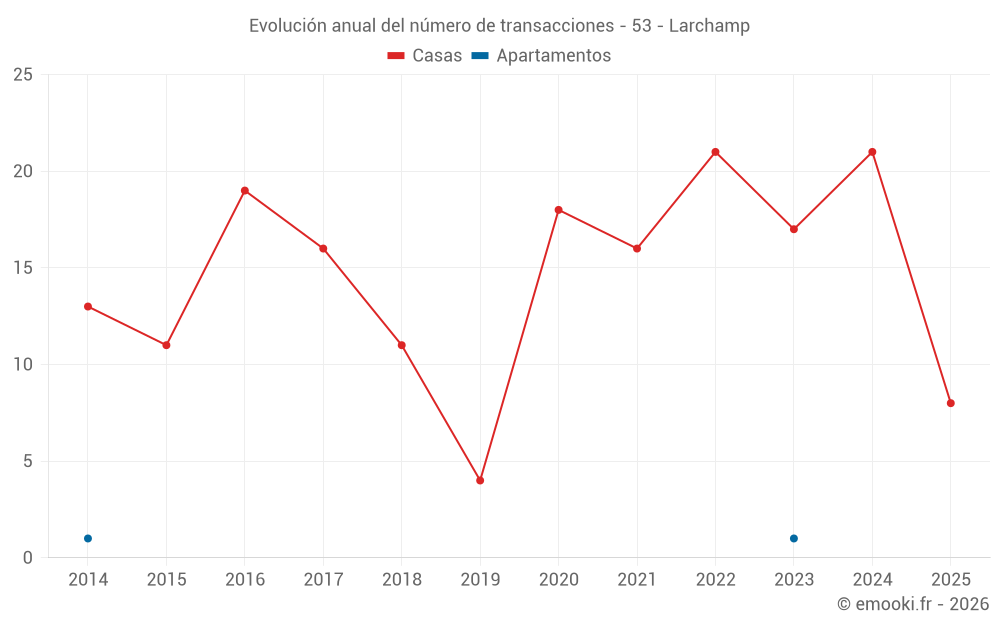 El precio mediano en las 40 transacciones de casas de los últimos 24 meses en la comuna de Larchamp fue de 1 132 € por metro cuadrado para un valor patrimonial medio de 100 000 €. Durante este período el 60% de las transacciones estuvieron entre 735 y 1 534 € por metro cuadrado (del 2º al 8º decil).