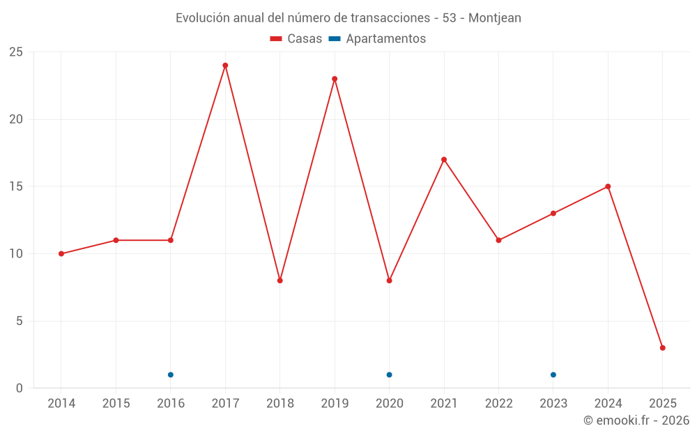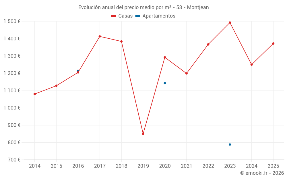 El precio mediano en las 26 transacciones de casas de los últimos 24 meses en la comuna de Montjean fue de 1 311 € por metro cuadrado para un valor patrimonial medio de 121 500 €. Durante este período el 60% de las transacciones estuvieron entre 745 y 1 846 € por metro cuadrado (del 2º al 8º decil).