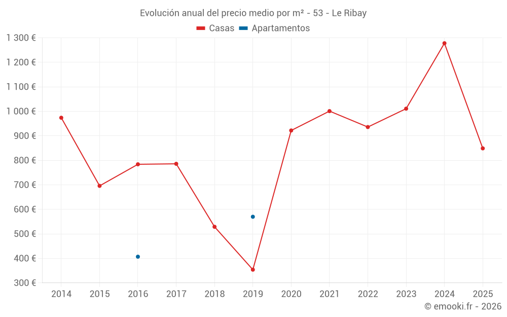El precio mediano en las 15 transacciones de casas de los últimos 24 meses en la comuna de Le Ribay fue de 929 € por metro cuadrado para un valor patrimonial medio de 75 000 €. Durante este período el 60% de las transacciones estuvieron entre 692 y 1 188 € por metro cuadrado (del 2º al 8º decil).