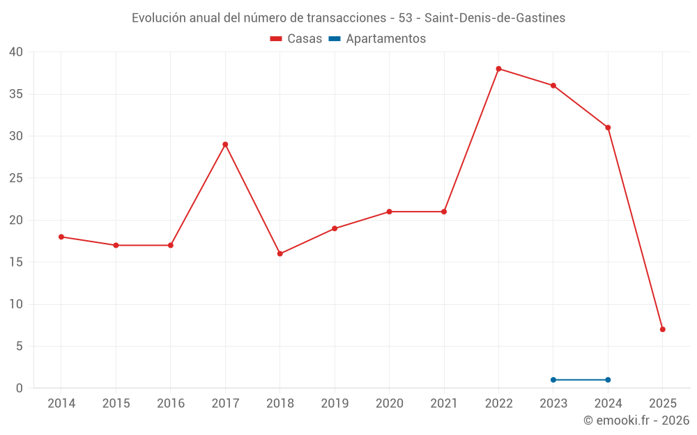 El precio mediano en las 22 transacciones de casas de los últimos 12 meses en la comuna de Saint-Denis-de-Gastines fue de 1 126 € por metro cuadrado para un valor patrimonial medio de 112 500 €. Durante este período el 60% de las transacciones estuvieron entre 936 y 1 421 € por metro cuadrado (del 2º al 8º decil).