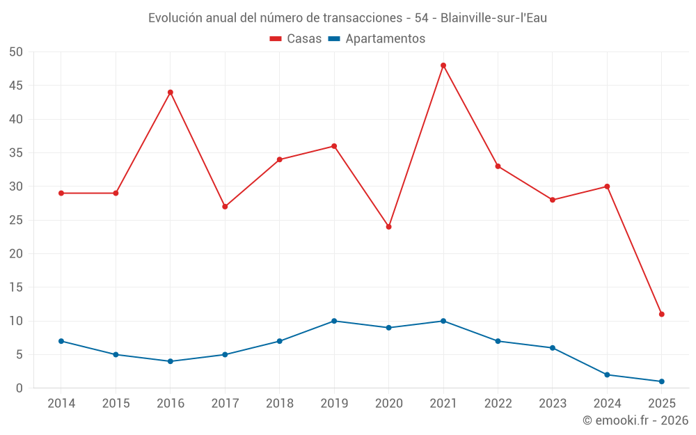 El precio mediano en las 28 transacciones de casas de los últimos 12 meses en la comuna de Blainville-sur-l'Eau fue de 1 863 € por metro cuadrado para un valor patrimonial medio de 175 000 €. Durante este período el 60% de las transacciones estuvieron entre 1 365 y 2 190 € por metro cuadrado (del 2º al 8º decil).