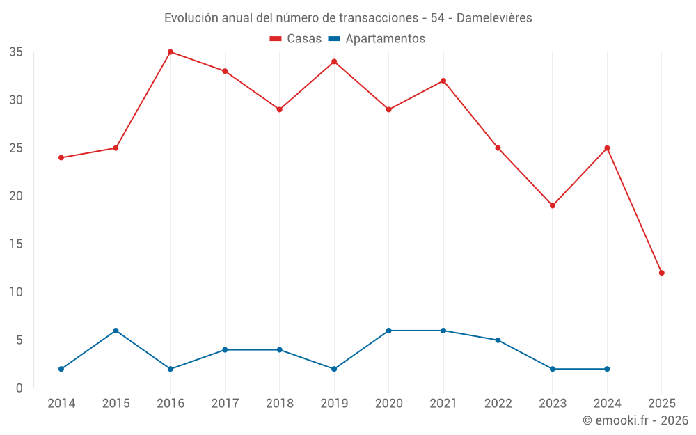El precio mediano en las 22 transacciones de casas de los últimos 12 meses en la comuna de Damelevières fue de 1 741 € por metro cuadrado para un valor patrimonial medio de 164 050 €. Durante este período el 60% de las transacciones estuvieron entre 1 506 y 2 165 € por metro cuadrado (del 2º al 8º decil).